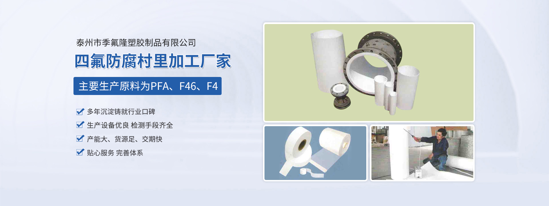 泰州市季氟隆塑膠制品有限公司(江蘇斯瑞沃爾科技發(fā)展有限公司)占地8000平方米,各類專用生產(chǎn)設(shè)備三十多合,現(xiàn)有員工近20人,其中技術(shù)人員10名,均多年從事該行業(yè)生產(chǎn),經(jīng)驗(yàn)豐富。本公司主要生產(chǎn)原料為PFA、F46、F4,主要為電磁傳感器、防腐管道、各種容器反應(yīng)釜三通四通彎頭及各種閥門等產(chǎn)品進(jìn)行防腐村里加工,長期為德國、日本、美國、新加坡等國在華合資公司配套,產(chǎn)品廣泛應(yīng)用于環(huán)保、油田、化工、造紙、冶金等行業(yè),產(chǎn)品質(zhì)量優(yōu)良,服務(wù)及時(shí)周到,一直深受顧客信賴。